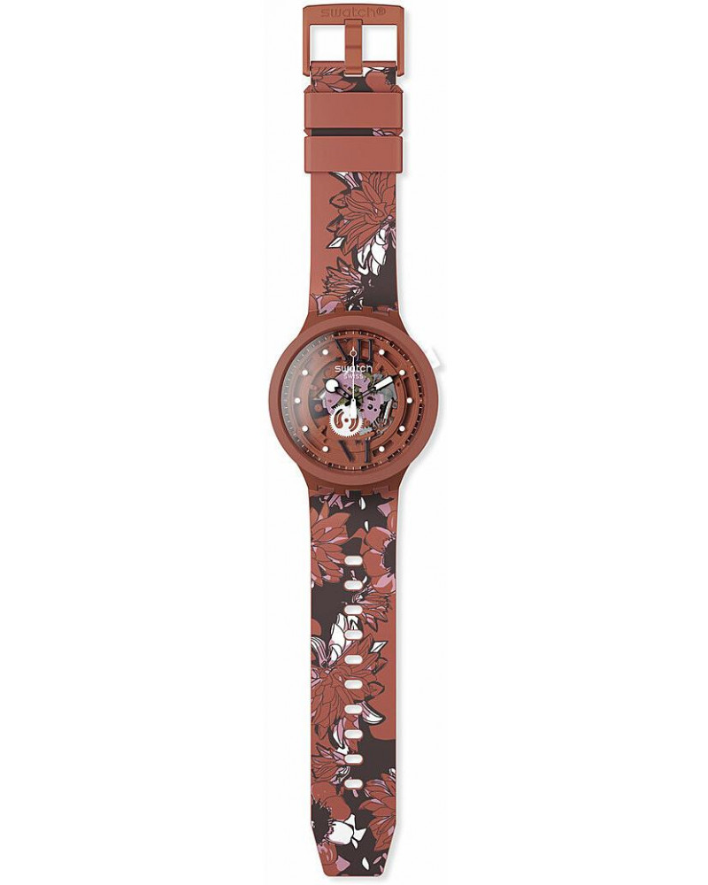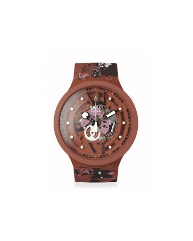 Quest’orologio floreale ha un tocco di creatività sul motivo stampato camouflage sul cinturino color mattone opaco. Anche la cassa in materiale biologico di quest’orologio con i fiori è color mattone e ospita un quadrante stampato trasparente e multicolore con lancette nere fosforescenti.