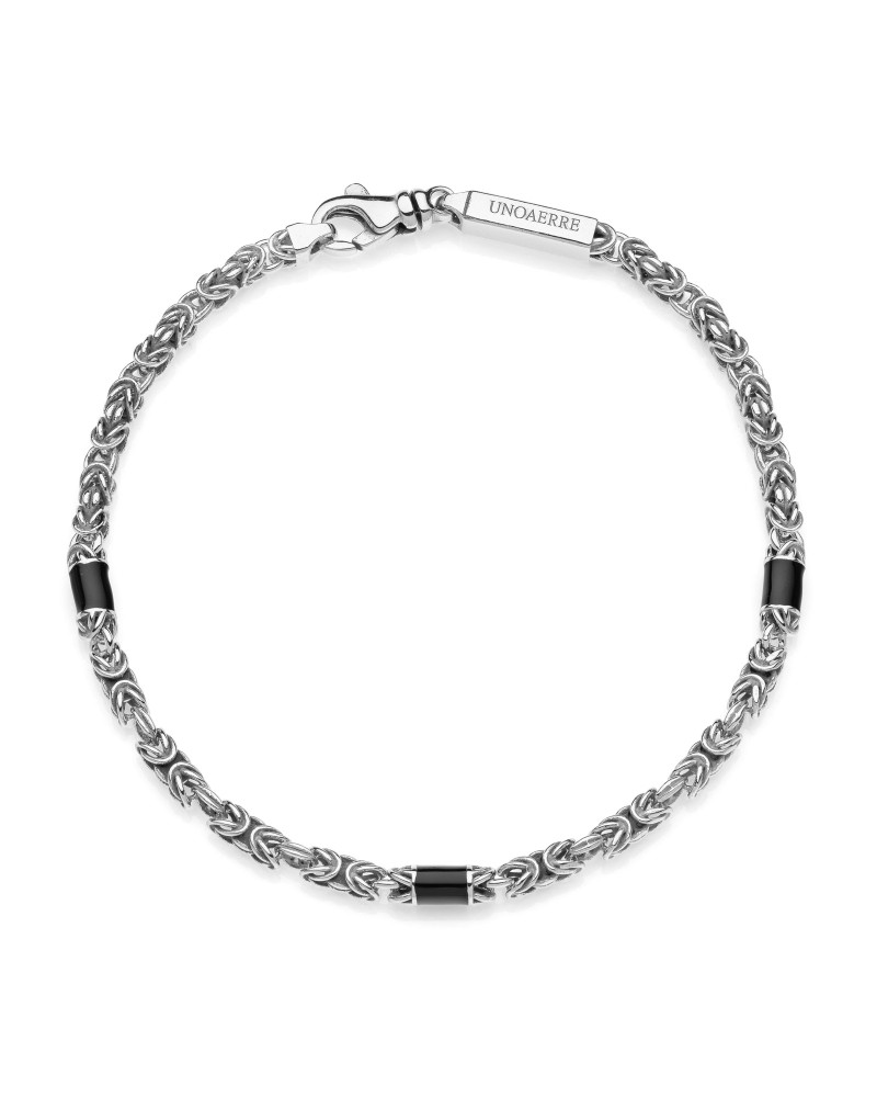 Bracciale uomo catena bizantina sottile in argento rodiato con dettagli in smalto nero. Chiusura a moschettone e logo UNOAERRE. Un grande classico del gioiello maschile reinterpretato in chiave moderna con finish rodiato e dettagli in smalto nero. Un tocco di stile deciso.