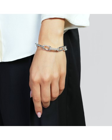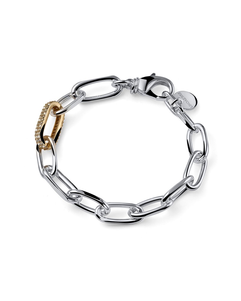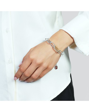 Bracciale catena fantasia argentata, dettaglio in maglia dorata e zirconi. Misura 21,00 cm. Rendi unico ogni tuo look con il design bold di questo bracciale donna catena bicolore. L'originale maglia in ottone placcato oro impreziosita da zirconi è il dettaglio unico che aspettavi. Acquista questo bracciale online e nelle migliori gioiellerie. Esprimi chi sei con gioielli e accessori moda originali e d'impatto.