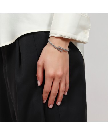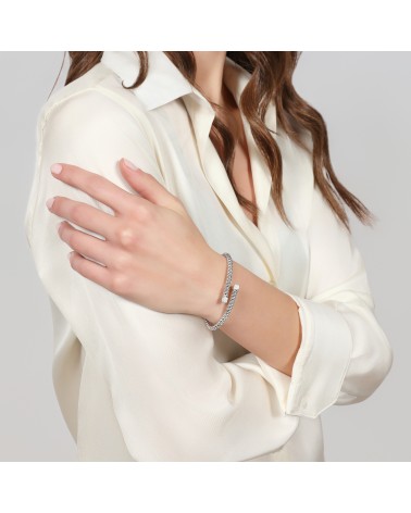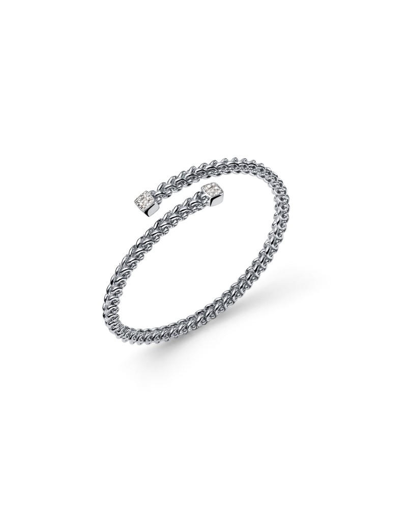 Bracciale bangle contrarié in argento rodiato, maglia chicco di riso e dettaglio in pavé di zirconia cubica bianca. Collezione Chicco.