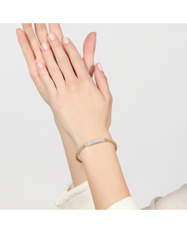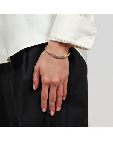 Bracciale bangle in argento bicolore, maglia chicco di riso e barretta con pavé di zirconia cubica bianca. Collezione Chicco.
