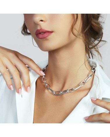 Collana catena fantasia argentata con dettaglio in maglia placcata oro giallo e zirconi. Misura 45,00 cm. Aggiungi un tocco deciso al tuo guardaroba con la nostra collana catena bicolore. Realizzata in ottone placcato argento 925 ed impreziosita dalla maglia dorata con zirconi, è il gioiello must-have per un dettaglio audace ad ogni tuo outfit. Scegli questo gioiello fashion su Unoaerre.it o nelle migliori gioiellerie. Perfetta sia da sola che con i gioielli donna coordinati.