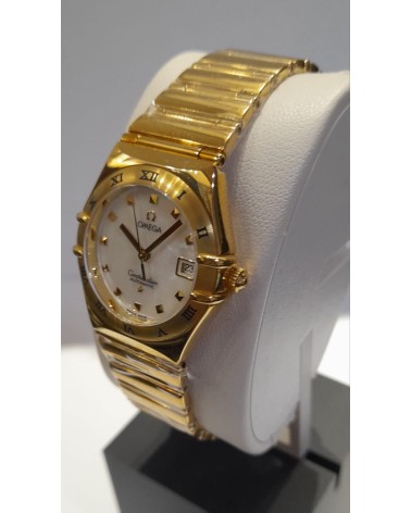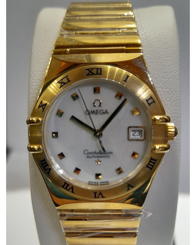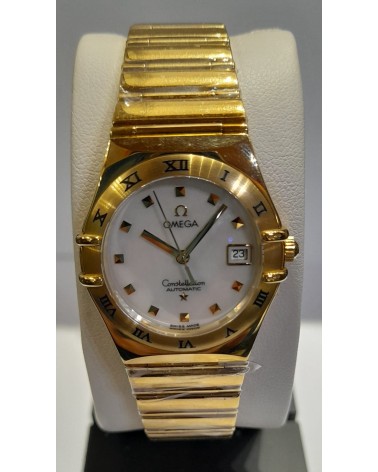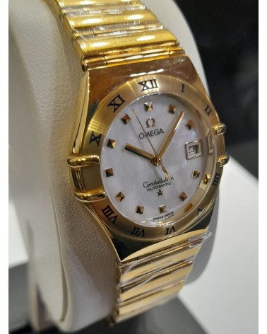 Orologio da donna con cassa e bracciale in oro giallo 18 carati, lunetta satinata con inciso le ore in numeri romani, quadrante in madreperla bianco con indici quadrati in oro giallo 18 carati, datario a ore 3, vetro zaffiro antigraffio bombato con trattamento interno antiriflesso, diametro 27.5 mm, impermeabile fino a 30 metri. Movimento a carica automatica con finitura rodiata, Cal. 2520. Riserva di carica: 42 ore Garanzia ufficiale Omega di 2 anni