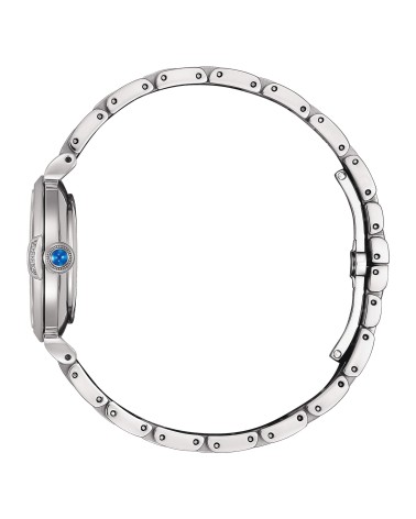Orologio donna eco drive solotempo,cassa e bracciale in acciaio con diamante su cassa ad ore 3. Diamante sul quadrante ad ore 8. Corona decorata da cabochon blu. Quadrante in madreperla azzurra.Vetro zaffiro convesso. WR 5 bar.