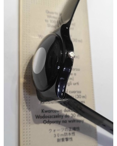 Orologio al quarzo, cinturino plastica nera,cassa bombata nera con quadrante bianco.