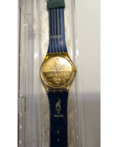 Orologio quarzo, cinturino in plastica blu, quadrante oro con scritte olimpiadi.