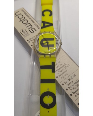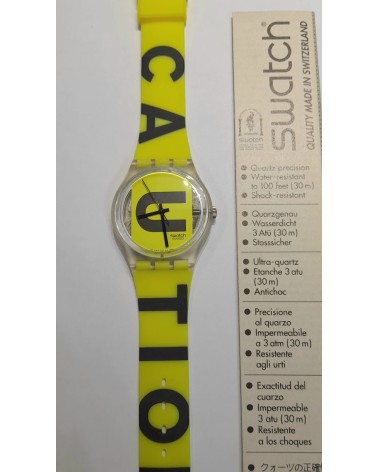 Orologio quarzo, cinturino in plastiica giallo fluo con scritta caution, quadrante giallo fluo.