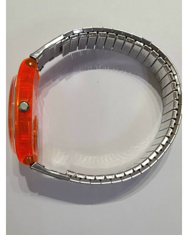 Orologio quarzo,bracciale elasticizzato acciaio e alluminio,quadrante stellato blu, cassa in plastica arancio.