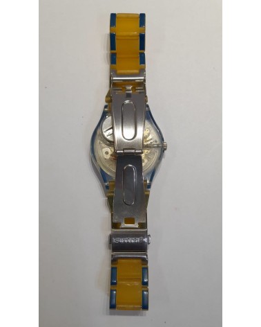 Orologio quarzo, bracciale in plastica giallo e blu, con chiusura in acciaio, quadrante scheletrato.