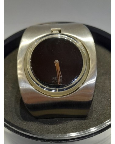Orologio al quarzo bracciale in acciaio con apertura sotto, quadrante nero.