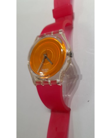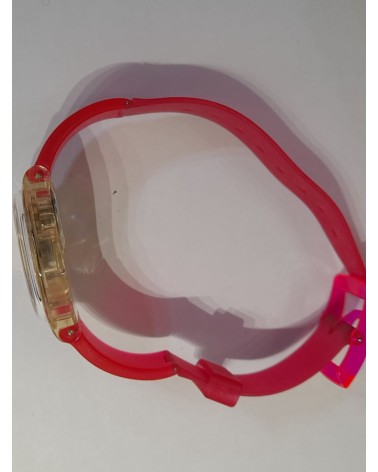 Orologio quarzo, cinturino in plastica fuxia, quadrante arancio, cassa in plastica trasparente.