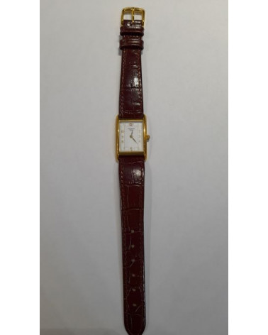 Orologio al quarzo, elegante, raffinato, cassa rettangolare in oro 18kt (750/000) cinturino in pelle marrone con fibbia laminata oro.