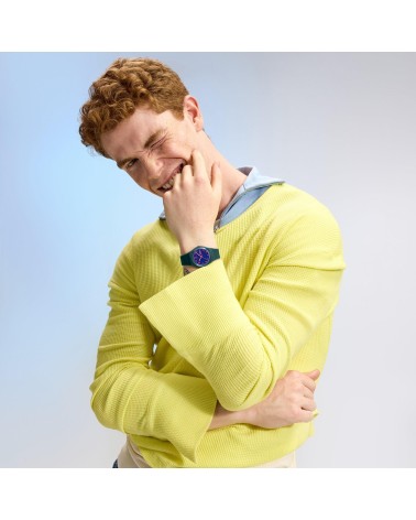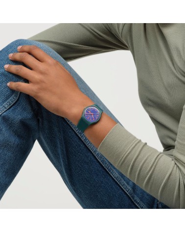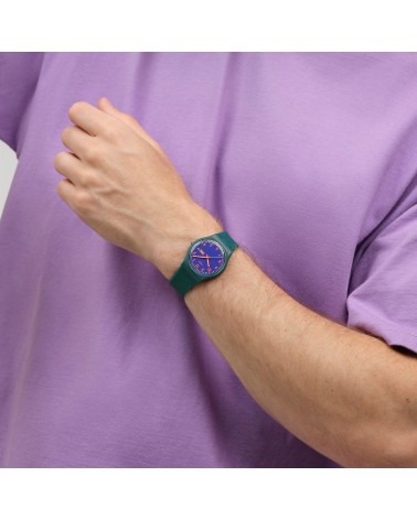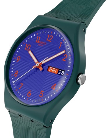 Questo orologio presenta un quadrante blu testurizzato con numeri stampati arancioni, tacche dei minuti stampate azzurre e arancioni e datario a ore 3. Sotto il vetro biosourced, l’orario è indicato da lancette delle ore e dei minuti arancioni che si illuminano al buio e da una lancetta dei secondi azzurra. La cassa in verde scuro opaco è completata da un cinturino verde scuro opaco testurizzato, da un passante blu opaco e da una fibbia di colore verde scuro opaco.