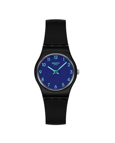 Questo piccolo orologio presenta un quadrante testurizzato blu scuro con numeri stampati in verde chiaro, lancette delle ore e dei minuti in verde chiaro che si illuminano al buio e una lancetta dei secondi nera in una cassa nera opaca. Completa l’orologio un cinturino testurizzato nero opaco con fibbia e passante neri opachi.