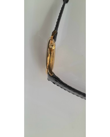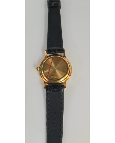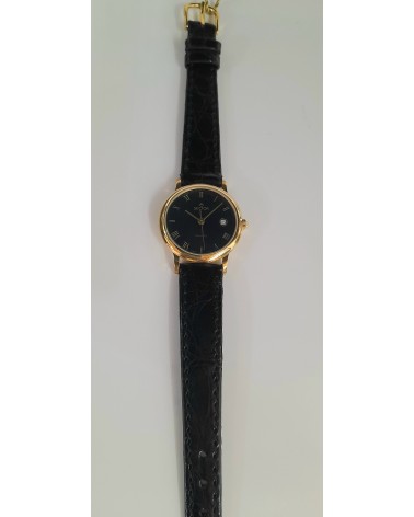 Orologio al quarzo donna, elegante, raffinato, in oro 18kt (750/000) quadrante nero con datario,cinturino in pelle nera.