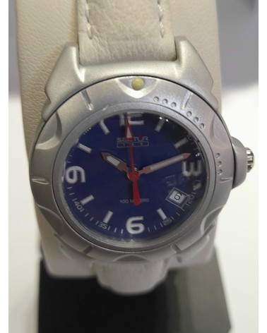 Orologio donna al quarzo, cassa in alluminio, cinturino in pelle bianca, quadrante blu.